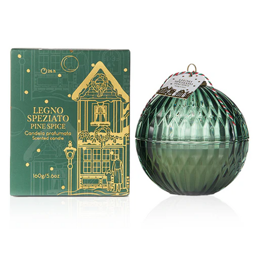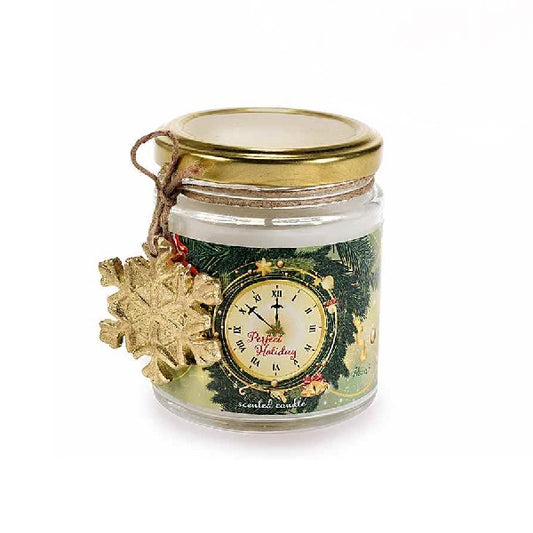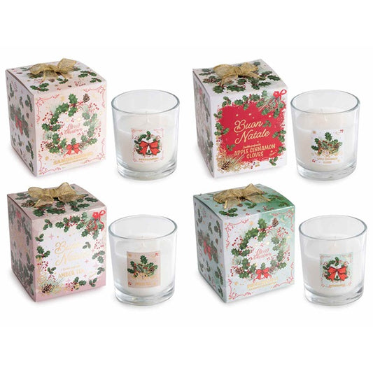 CANDELA IN VETRO DECORATO NATALIZIO SCATOLA FIOCCO E CAMPANELLI