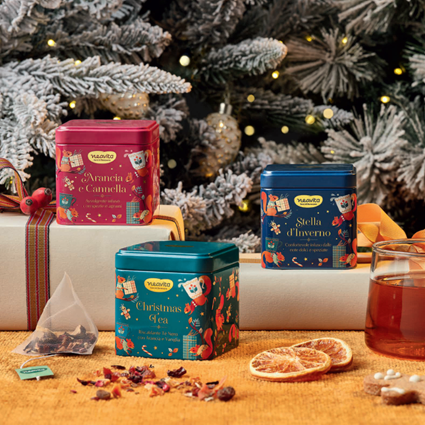 Barattolino in metallo decorato contenente 6 filtri scrigno di Infuso Fiocchi di Neve, Caldo abbraccio e Fuoco del caminetto.
