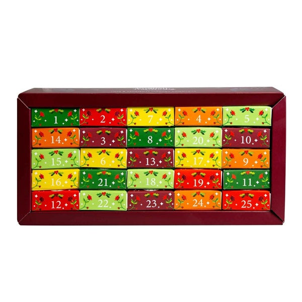 Questo grande calendario dell'Avvento può essere posizionato in verticale e aggiunge un meraviglioso tocco natalizio alla tua casa! Una volta aperta la scatola, si scoprono venticinque (invece delle solite 24) scatoline di cartone colorate con splendide decorazioni natalizie. Ogni scatola contiene una bustina di tè contenente una delle 24 diverse varietà di tè e miscele di tè pregiati. C'è anche un tè extra da gustare il 25 dicembre!
