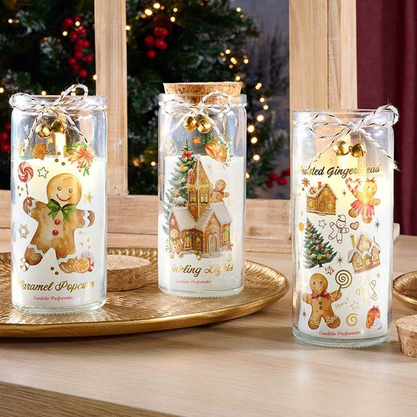 Candele di Natale design Biscottini Pan di Zenzero profumate in barattolo di vetro con coperchio con campanella e nastrino.