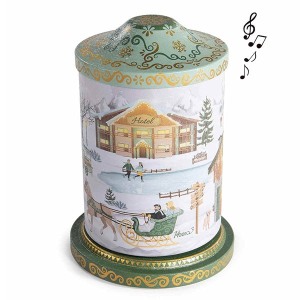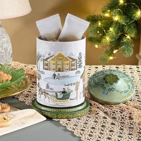 Scatole di Natale in metallo con carillon e stampa natalizia a paesaggio di Natale innevato con all'interno 15 filtri di infusi di frutta.