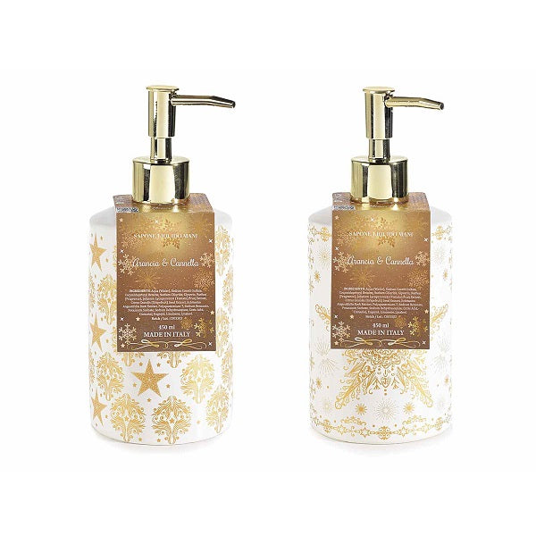 Dispenser natalizio con sapone mani fragranza arancia & cannella in ceramica "Natale Regale" con stampa fiocchi e stelle.